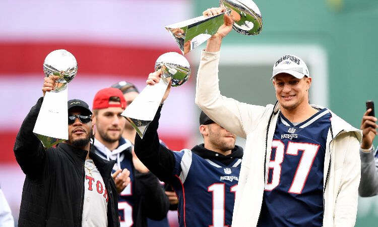 “That was dangerous how I dented that trophy, but I always blame that on Julian Edelman. He threw me the pitch,” Gronkowski said.